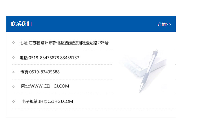 地址:常州市新北區友邦商務大廈1幢16、17層  電話:0519-85101652  傳真:0519-85112595  郵編:213022  網址:www.cz-jiayue_cn.zat168.com  郵箱:xiajifengaa@163.com